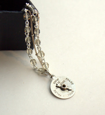 My recent purchase: a quirky, whimsical VINTAGE lie detector charm with moveable arm. I wasn't sure if I wanted to hang this unique pendant from a silver chain or perhaps some bead chain so I decided on both. I felt that using 2 necklace chains would give the necklace more depth and greater visual interest. First is a sterling silver satellite chain from which the pendant hangs and the second is champagne faceted glass beads that have been linked together with silver wire. With two different chains used together, the necklace takes on a more elegant feel.